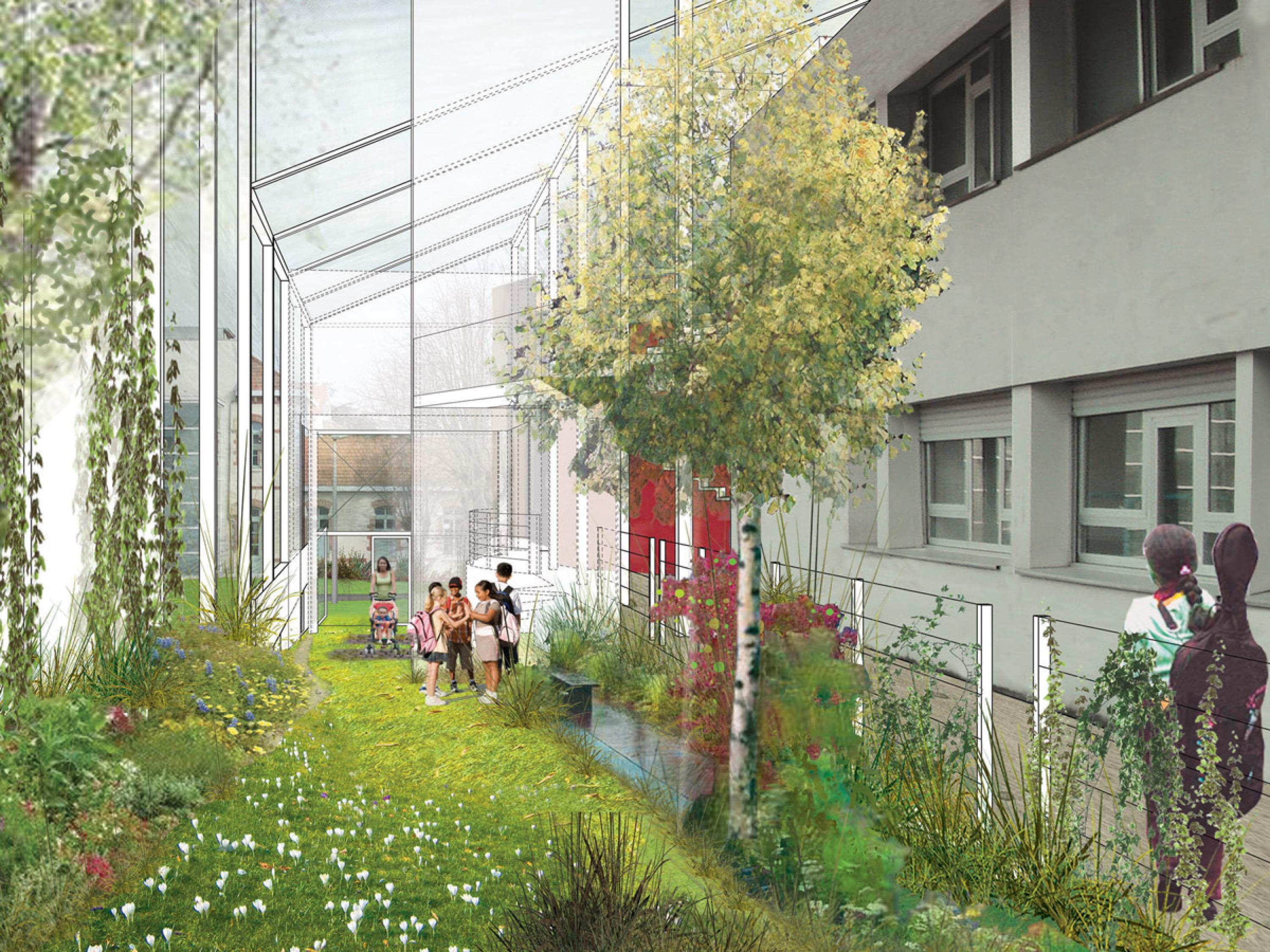 L'utilisation des serres horticoles en couverture de l'ensemble du projet à l'avantage de donner à voir un édifice unifié, de constituer une enveloppe en double peau améliorant les performances thermiques et acoustiques du bâtiment, de fabriquer des espaces interstitiels généreux offrant des qualités d'ambiances, de parcours et d'usages accrus et originaux.